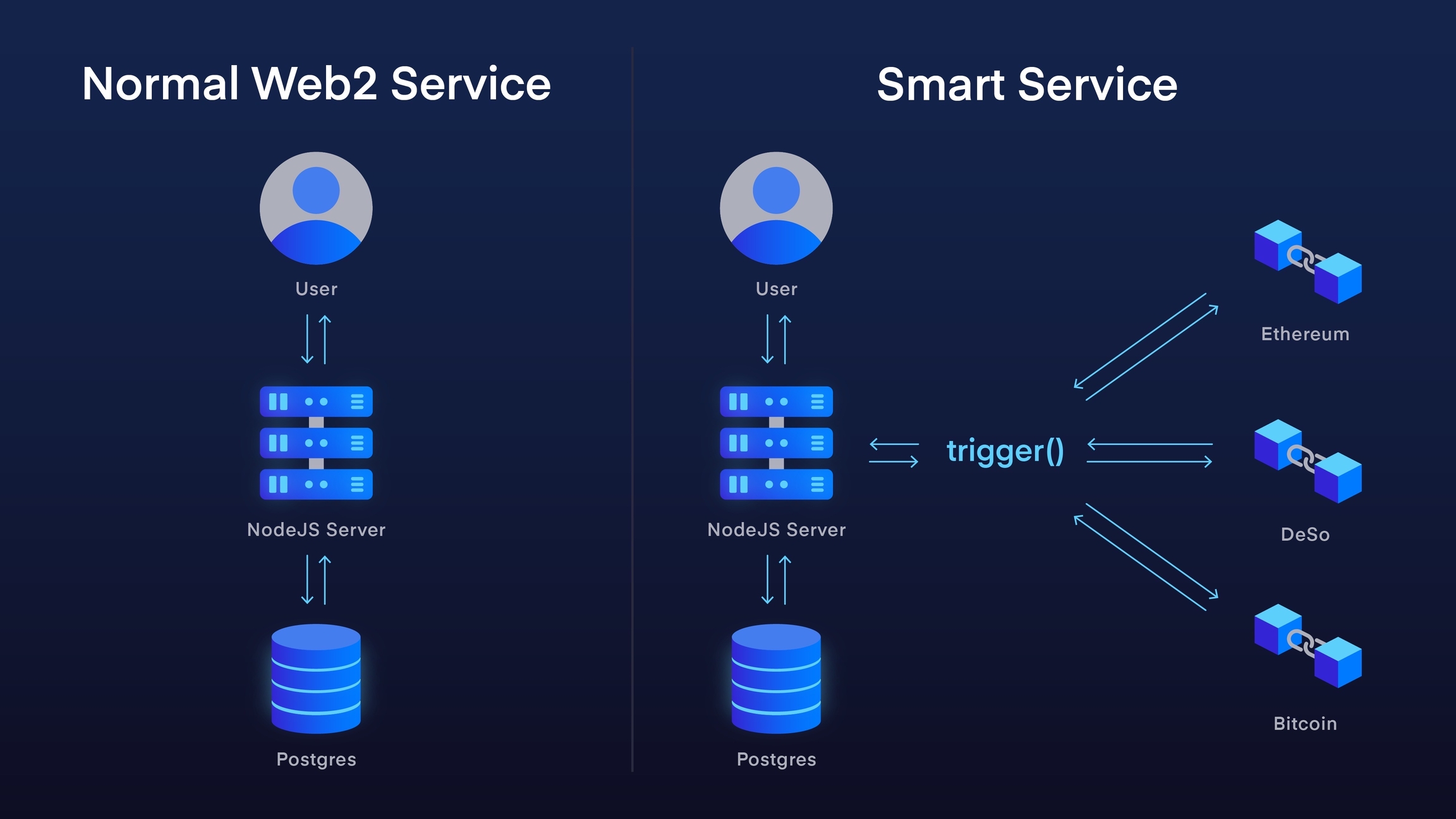 trigger()function could also operate in a totally cross-chain fashion, e.g. enabling DESO to move between wallets when ETH is sent to the smart service's ETH address.As the smart services framework matures, developers can start substituting a generic